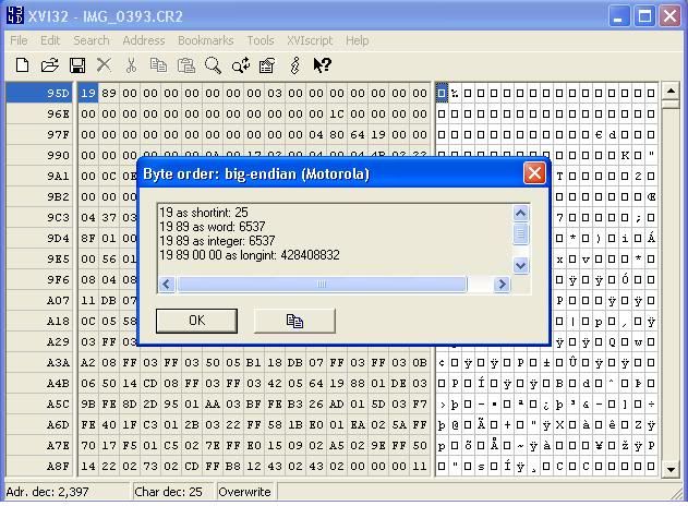 Trong thẻ Data Inspector chọn mục big-endian (MOTOROLA)